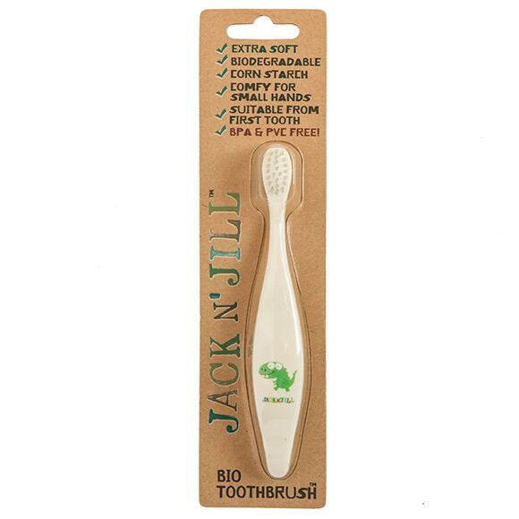 Superfin -tandbørste fra Jack N 'Jill med Dino på. Det vigtigste er, at tandbørsten er bæredygtig og dermed både godt for dit barn og klimaet.