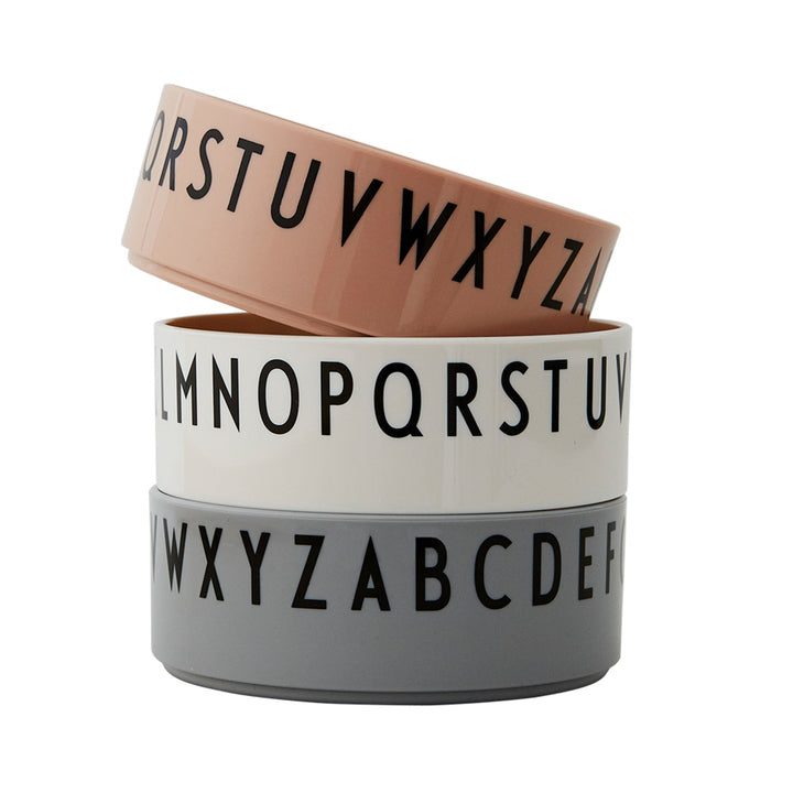 Design Booksens superlegante skåle kan bruges til det måltid, du ønsker. De fine skåle har en høj kant, så det er derfor let for dit barn at skubbe maden ved kanterne. Skålene har hele alfabetet fra A-Z omkring kanten. De kan modstå både mikrobølgeovn og opvaskemaskine, og de er lavet af 100 % tritan.