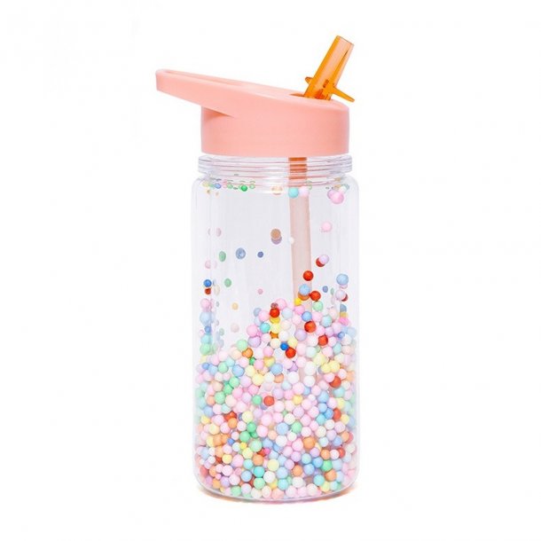 Drikkeflasken har sin meget flot lyserøde farve. Selve drikkeflasken er gennemsigtig, så du kan se de fine pops, men du kan også se det fine halm, der matcher låget, der giver drikkeflasken en super glans. Drikkeflasken har de sødeste pops på siderne, der er i de fineste farver og giver drikkeflasken et specielt look.