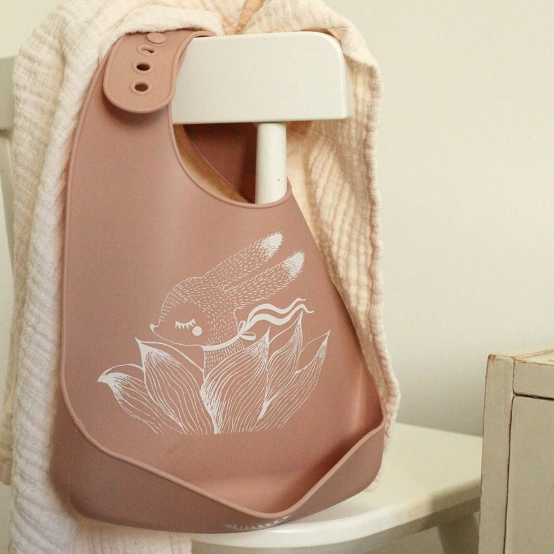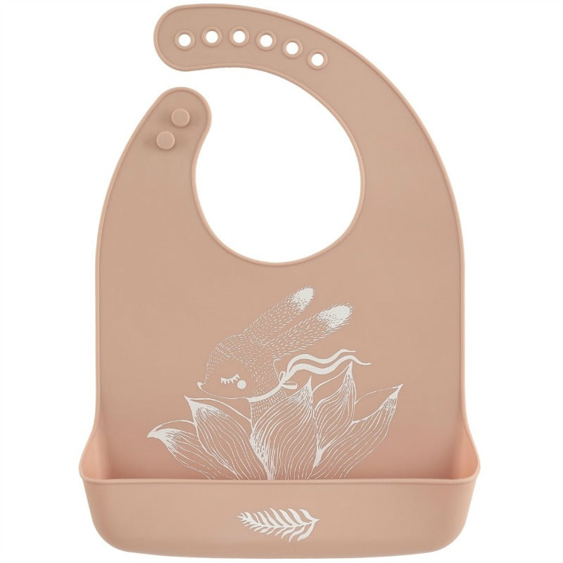 supersmart smæk fra af Lille Vilde. Det er lavet af 100 % mad -godkendt silikone, som er fri for farlige kemikalier. Spændingen har en samler, så mad ikke ender på hverken gulv eller tøj. Motivets motiv er blomsterkaninen fra skoven.