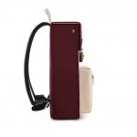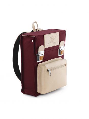 Børnetaske er lavet af Holdbart, vandbestandig nylon og læder. Hovedrummet er lukket med en retrore -reflekterende spænde, hvilket øger synligheden i mørke. Lommen på fronten er i læder og har en lynlås.