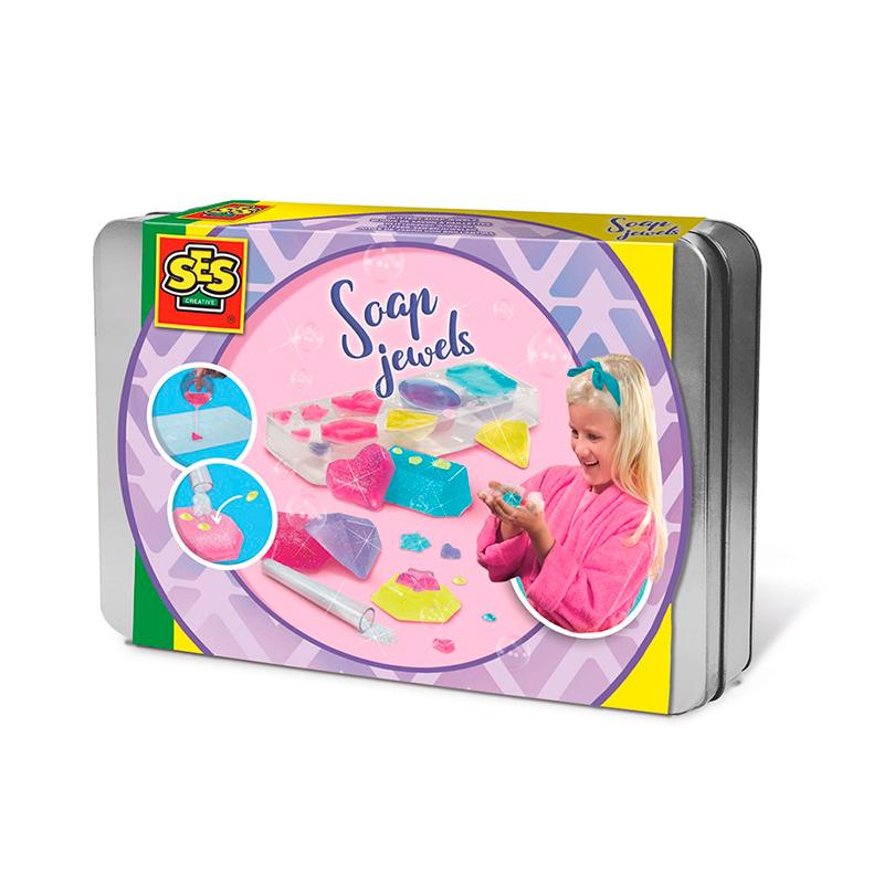 Med dette sæt fra SES Creative kan du lave dine helt egne glitter -sæber. Sæben er støbt i juvelformer. Du kan forme sæben i de samme farver, bland i dine egne nye farver eller lave flere forskellige lag.