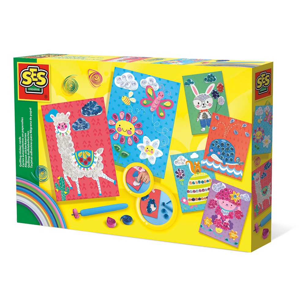 Med dette sjove sæt fra SES -kreative kan børn bruge arkene med gennemsigtige klistermærker og lave pæne kunstværker med quilling! De mest sjove og fineste kort kan komme ud af disse værktøjer.