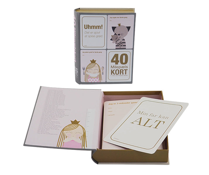 Du får 40 kort, som hver måler 10 cm x 15 cm. Du kan skrive på både for- og bagside, så alle vigtige minder kan gemmes. Kortene er lavet af stærkt pap, så de er super holdbare og vil ikke kollapse gennem årene. Derudover kommer kortene i en dejlig kasse med magnetisk lukning, så du kan sørge for, at de ikke falder ud.