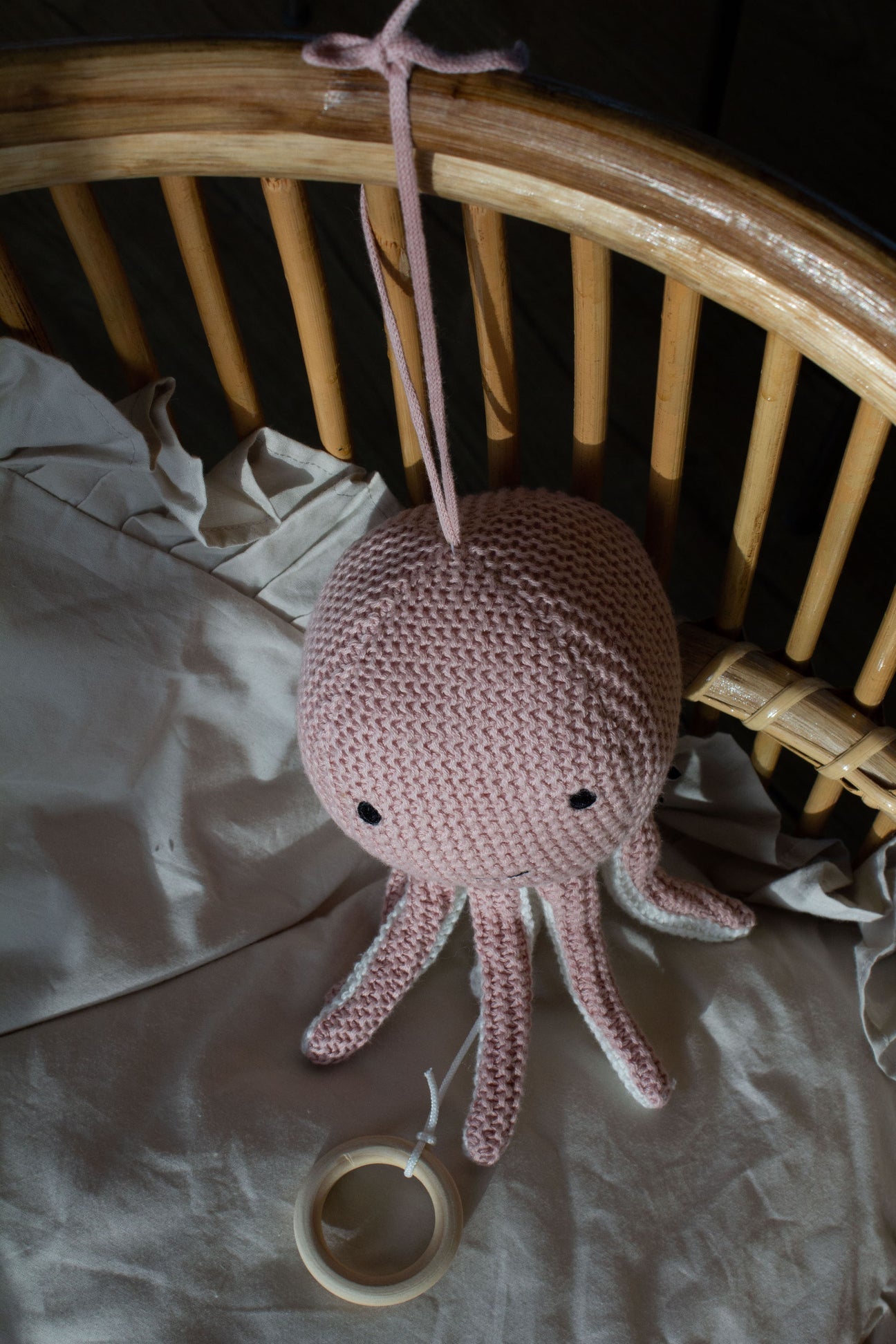 Denne fine musikalske alarm er fra Vanilla Copenhagen og vil være et hit med den lille. Det er en sød strikket blæksprutte.