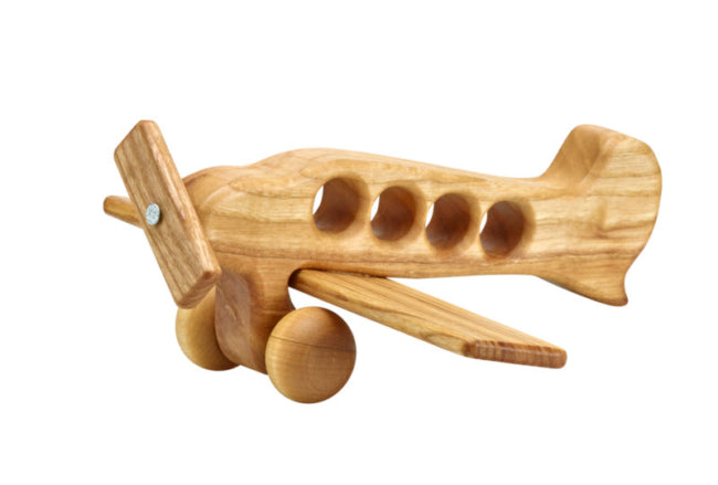 Passagerplan af træ med hjul og roterende propell. Det er holdbart produceret og behandlet med organisk olie.