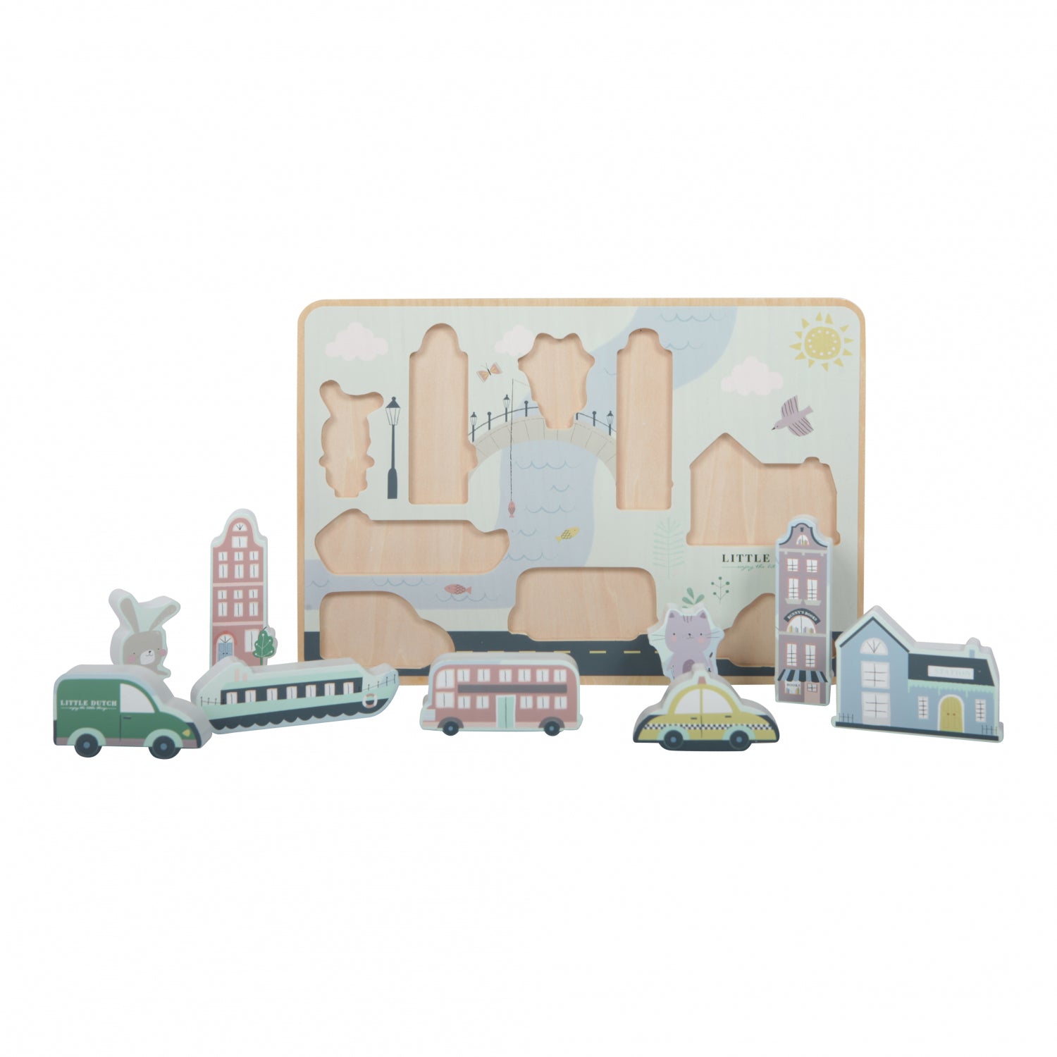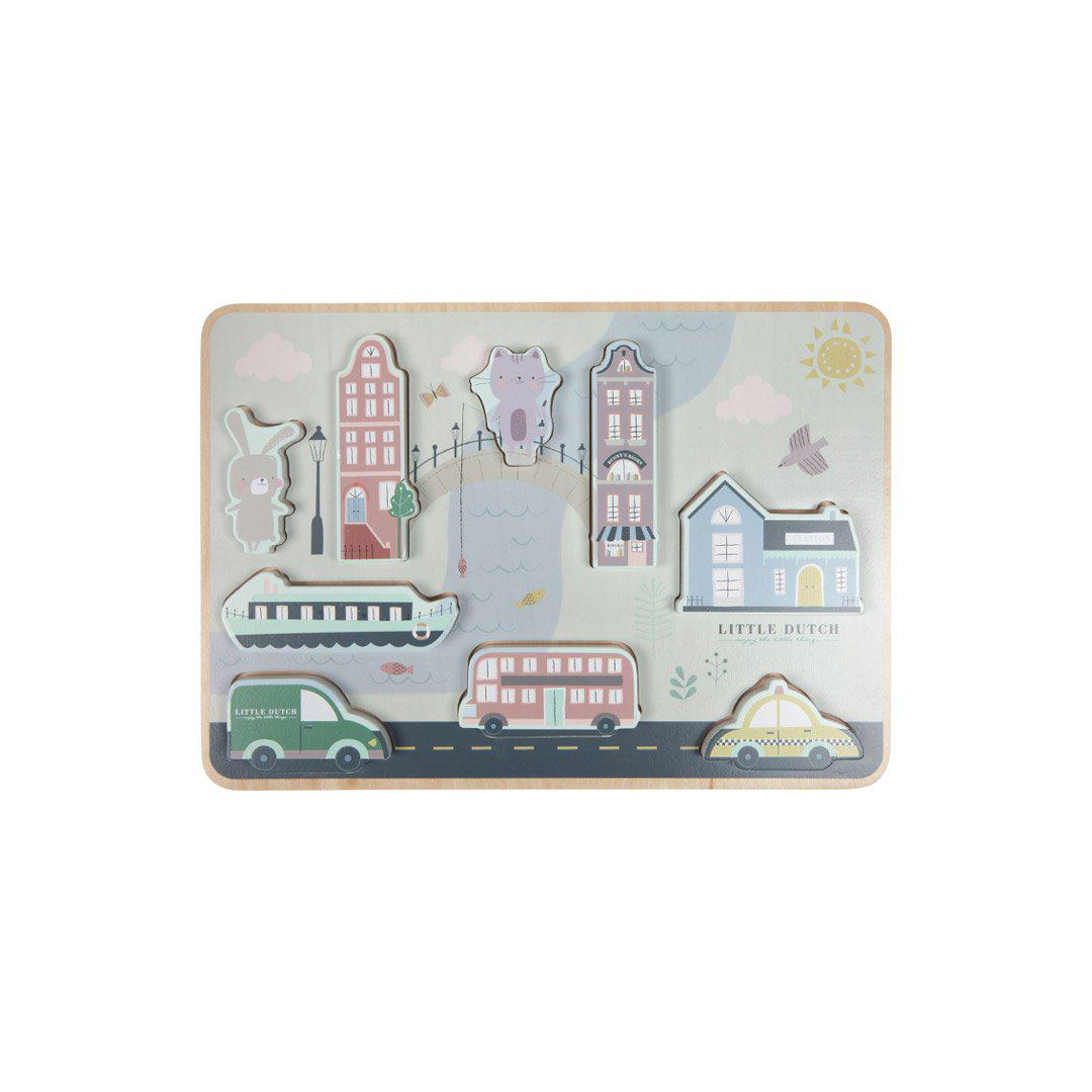 Lille hollandsk har produceret dette fine puslespil, der udfordrer barnet og hans motoriske færdigheder, mens han stimulerer forskellige sanser på grund af de forskellige former og farver. Puslespillet består af 9 stykker med forskellige motiver, både køretøjer, bygninger og dyr.