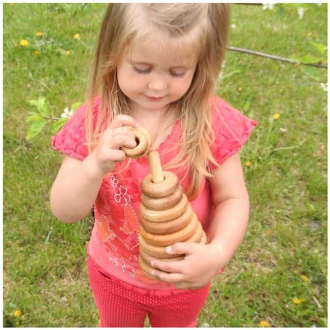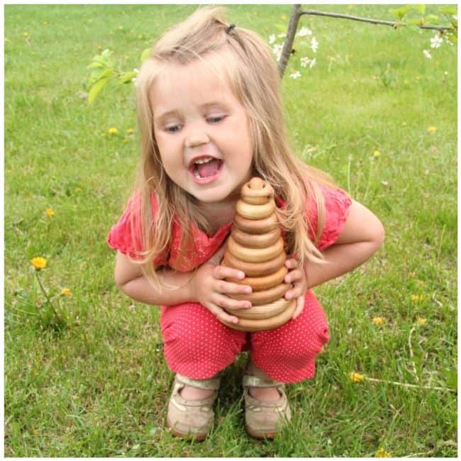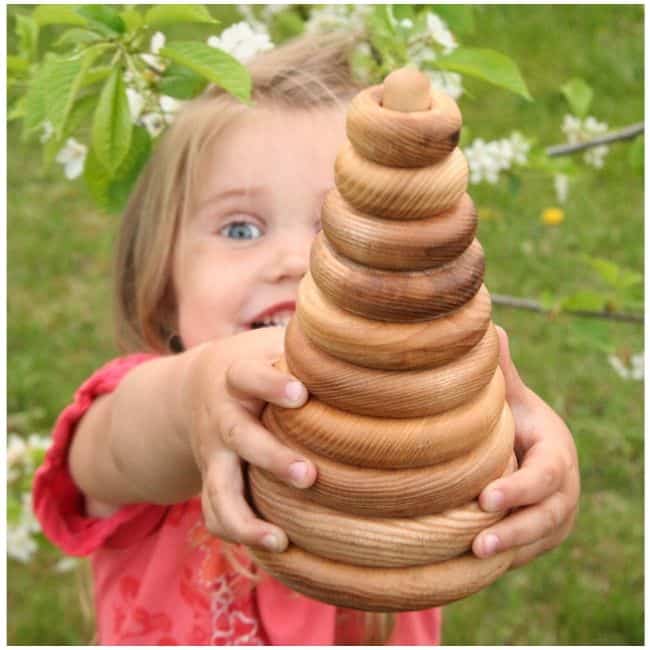 Stablingstårn med 9 rund træ. Med tårnet træner barnet fine motoriske færdigheder og koordination af hånd-øje. Håndlavet i fast kasse og behandlet med organisk olie.