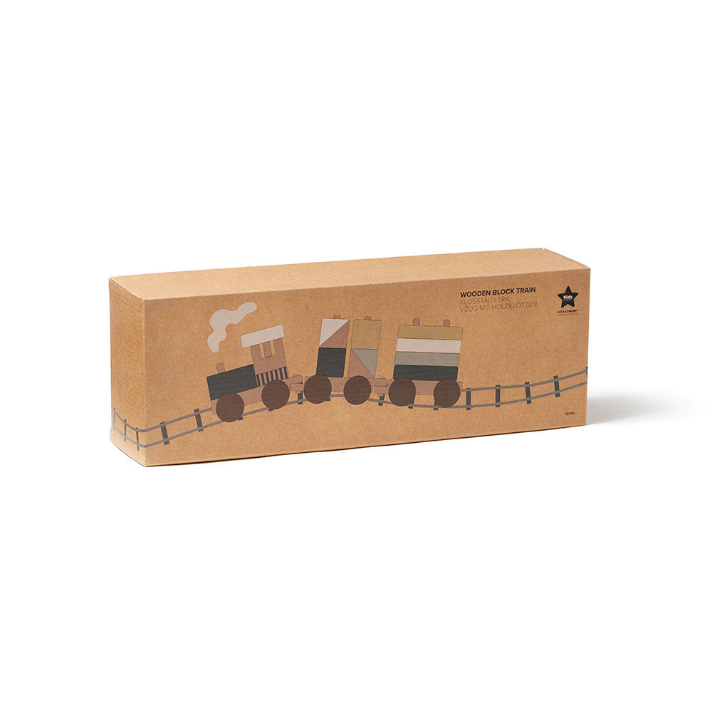 Fin træstog fra Kid's Concept. Toget leveres med pæne træblokke, der kan stables på forskellige måder på toget.