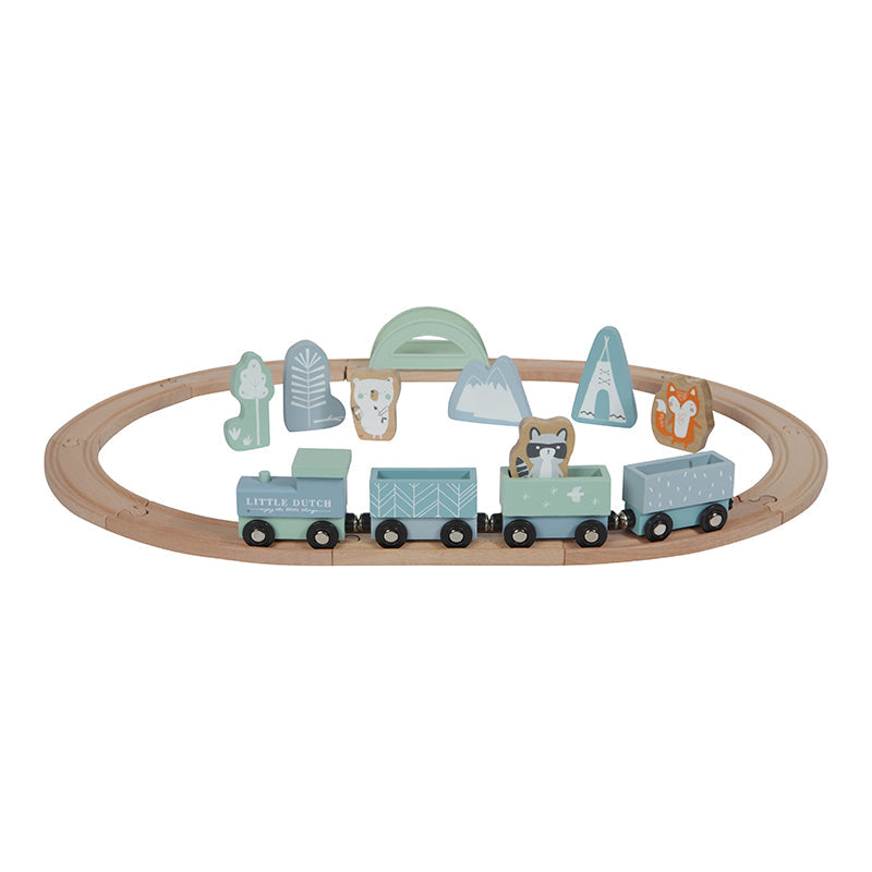Togspor fra Little Dutch Inkl. Tog biler og miljømæssige figurer, såsom træer, dyr, bjerge og telte. De små dyr kan sidde i togbilerne og køre rundt.